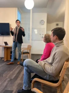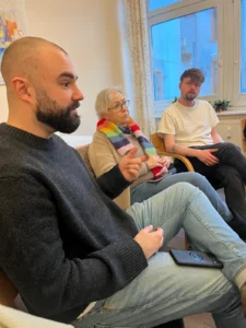 Die ehrenamtliche Arbeit der Tafel stand im Mittelpunkt eines Besuchs von zwei Vertreter*innen der Tafel Bad Vilbel im Rahmen eines Vorstandstreffen unseres Vereins. Etliche der in Bad Vilbel lebenden Geflüchteten nutzen die Möglichkeit, gegen Vorlage eines Kundenausweises der Einrichtigung Lebensmittel zu erhalten. Dabei erfolgt die Lebensmittelausgabe für sie und andere Betroffen wie Familien und Einzelpersonen, wenn ein geringes Einkommen vorliegt, also an Geringverdienende, ALG I- und ALG II-BezieherInnen, SozialhilfeempfängerInnen, aber auch Seniorinnen und Senioren mit niedriger Rente. Es wird eine symbolische Zahlung von einem Euro unabhängig von der Personenzahl fällig.