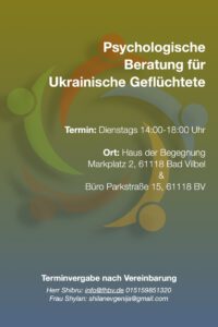 Uns ist es gelungen eine ausgebildete Psychologin aus der Ukraine für die psychologische Betreuung ukrainischer Flüchtlinge zu gewinnen.